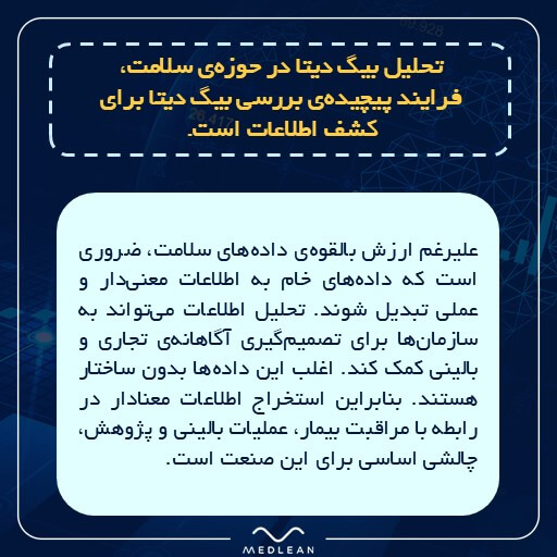 تحلیل بیگ دیتا در حوزهی سلامت، فرایند پیچیدهی بررسی بیگ دیتا برای کشف اطلاعات است. این اطلاعات، الگوهای پنهان، روند بازار، همبستگیهای ناشناخته و ترجیحات مشتری را شامل میشود. تحلیل اطلاعات میتواند به سازمانها برای تصمیمگیری آگاهانهی تجاری و بالینی کمک کند. صنعتی که با محوریت دادههای پزشکی شکل میگیرد بیشترین پیچیدگی را میان صنایع دارد. این دادهها نه تنها از منابع مختلفی تهیه میشوند، بلکه باید با مقررات دولتی نیز مطابقت داشته باشند. این فرایند دشوار و ظریف است و نیازمند سطوحی از امنیت و ارتباط است. راهکارهای تحلیلی به شیوههای مختلف و با تمرکز بر ۳ حیطهی ارائهدهندگان خدمات سلامت، پرداختکنندگان خدمات درمانی و مدیریت سلامت جمعیت، میتوانند بر صنعت سلامت تأثیرگذار باشند.